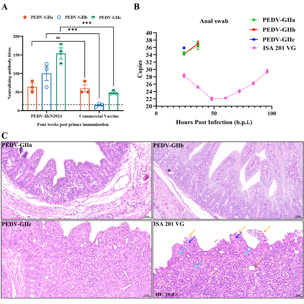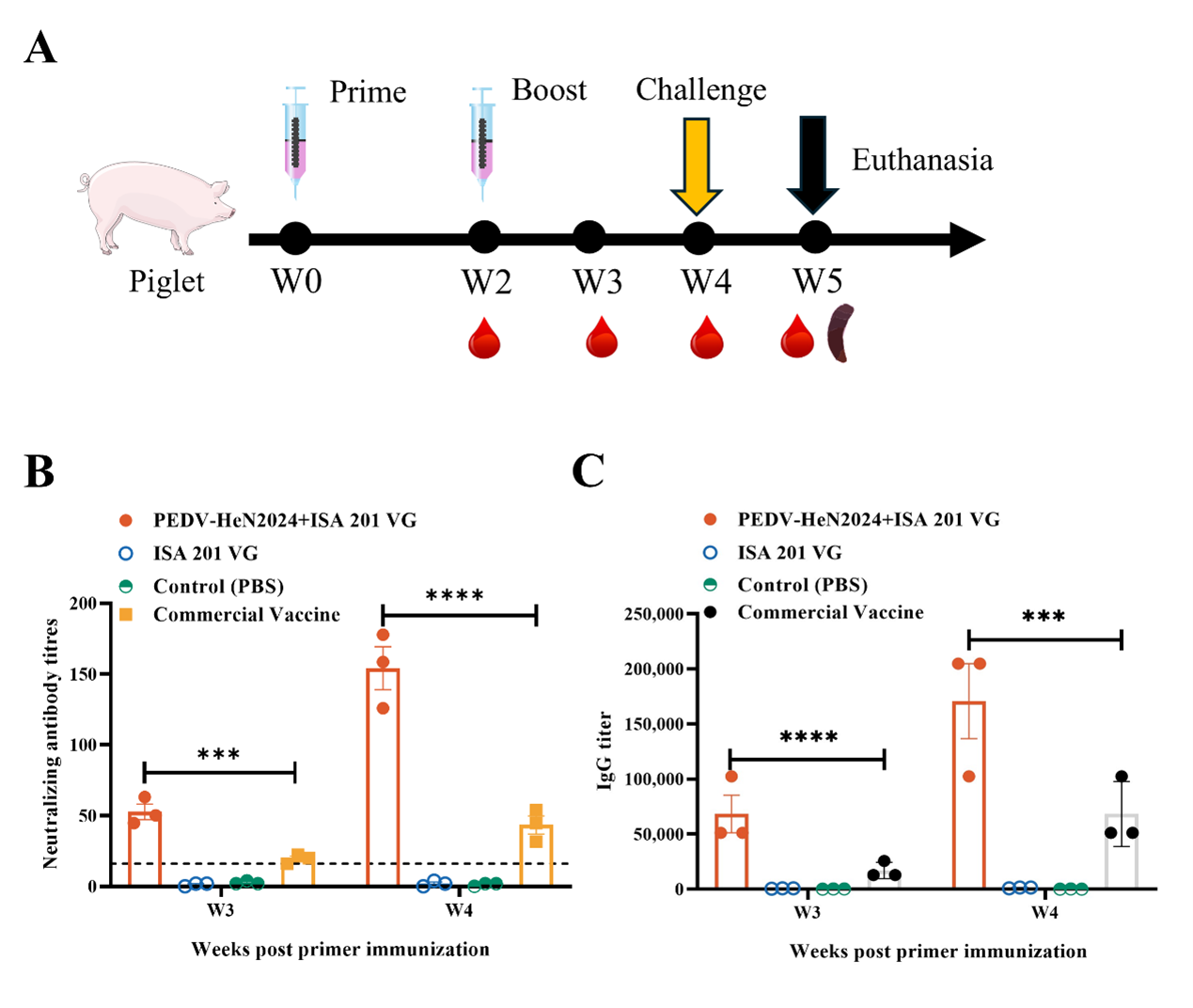 研究结果显示,基于PEDV-HeN2024毒株制备的灭活疫苗(采用ISA 201 VG佐剂)具有良好的免疫原性。疫苗接种后,可诱导产生高水平的病毒中和抗体(图3)。