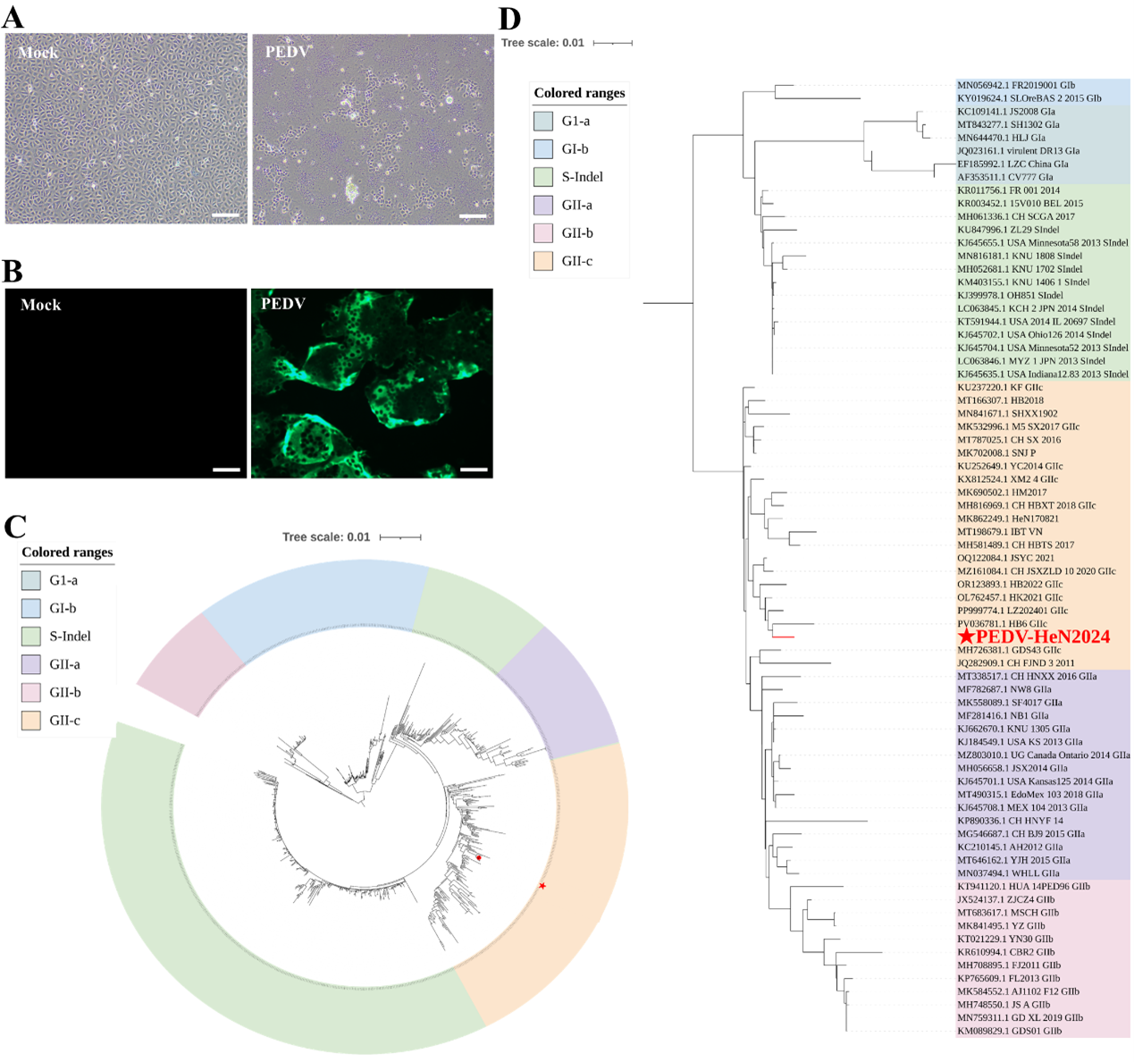 猪流行性腹泻病毒(PEDV)是危害全球养猪业的重大病原之一,尤其对新生仔猪具有高致病性和高死亡率。近年来,GII 基因型变异株(包括 GIIa、GIIb、GIIc)已成为流行优势株,其抗原性变异导致基于经典毒株的传统疫苗保护效果受限。申联生物研发团队聚焦于此行业痛点,从临床样本中成功分离并鉴定出一株新兴的 GIIc 变异株 PEDV-HeN2024(图 1),该毒株具有很高的致病性(图 2)。