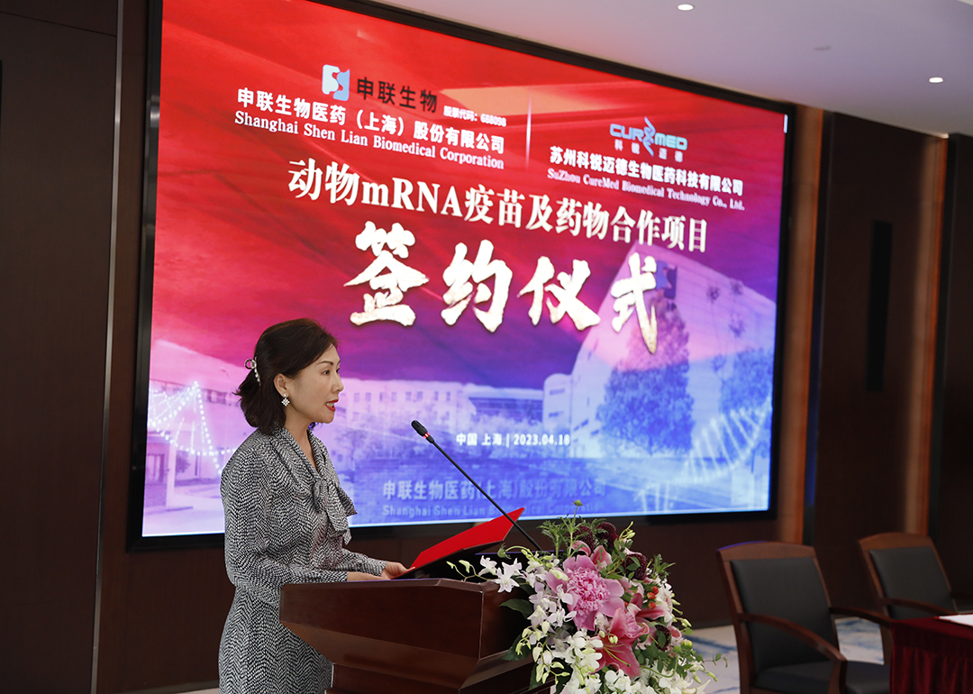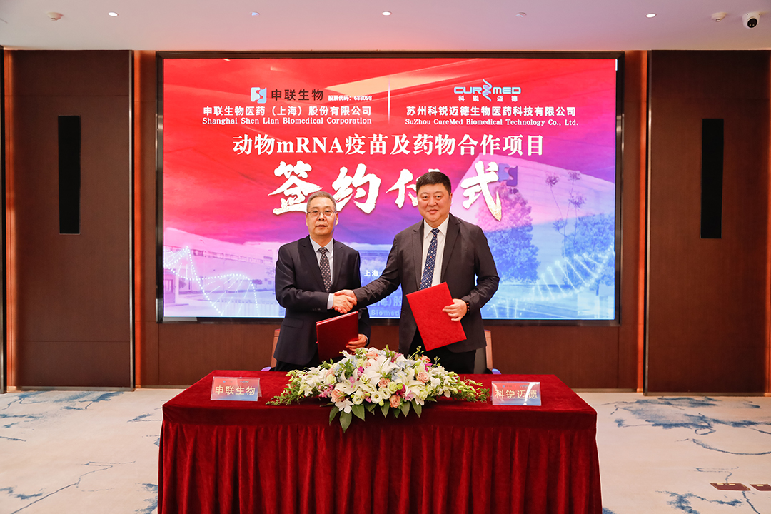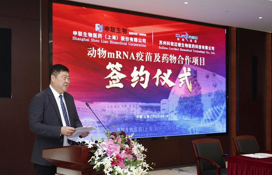 2023年4月18日,申联生物医药(上海)股份有限公司与苏州科锐迈德生物医药科技有限公司在上海紫竹高新区举行“动物mRNA疫苗及药物合作项目”签约仪式。上海紫竹高新区管委会副主任、上海紫竹高新区(集团)有限公司副总经理夏光,招商总监任曼,申联生物董事长聂东升,科锐迈德董事长刘毅翔及双方项目相关核心人员出席了仪式。