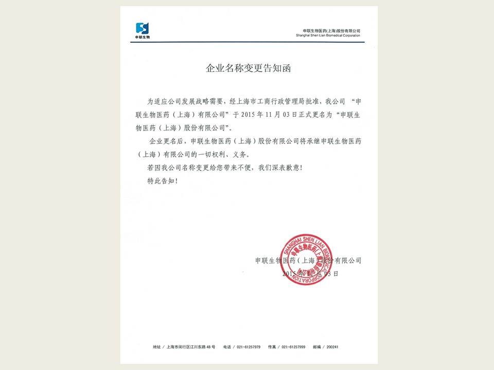 2015年11月03日,为适应公司发展战略需要,“申联生物医药(上海)有限公司”正式更名为“申联生物医药(上海)股份有限公司”。企业更名后,申联生物医药(上海)股份有限公司将继承申联生物医药(上海)有限公司的一切权利、义务。