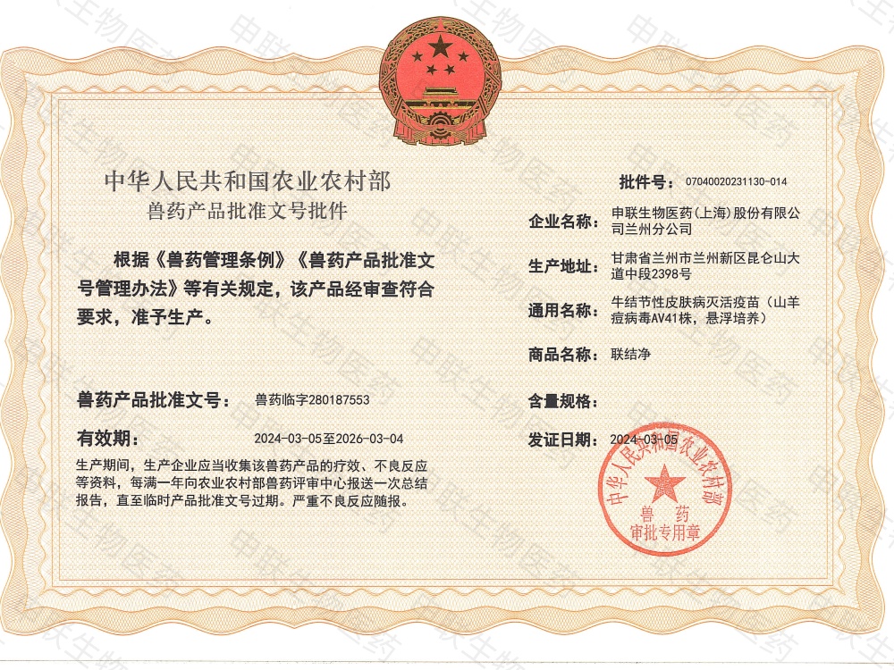 牛结节性皮肤病灭活疫苗(山羊痘病毒AV41株,悬浮培养)